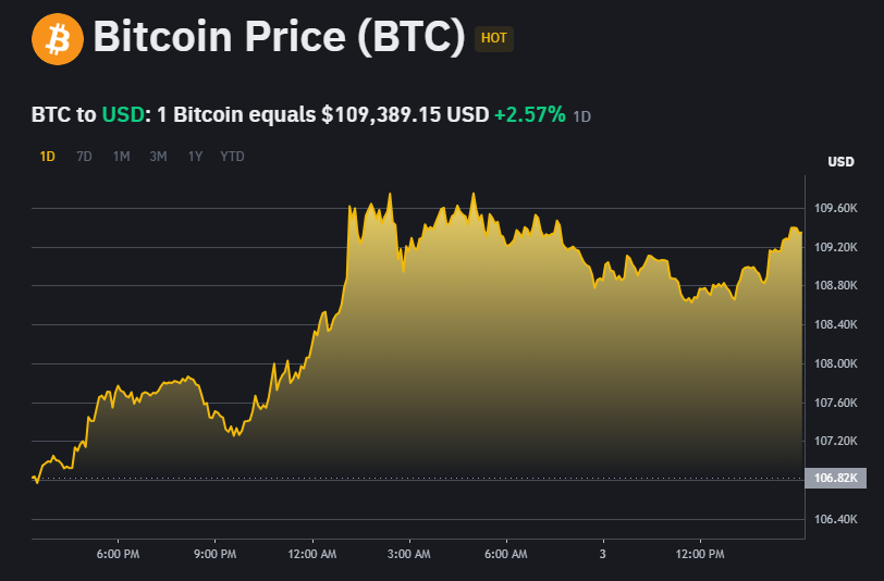 2025년 7월 2일 기준으로 비트코인은 다시 상승 흐름을 타며 시장의 주목을 받았습니다. 하루 사이 약 2.4%의 상승률을 기록하며 109,300달러 선에 안착했으며, 이는 최근의 하락세 이후 의미 있는 반등으로 해석되고 있습니다.